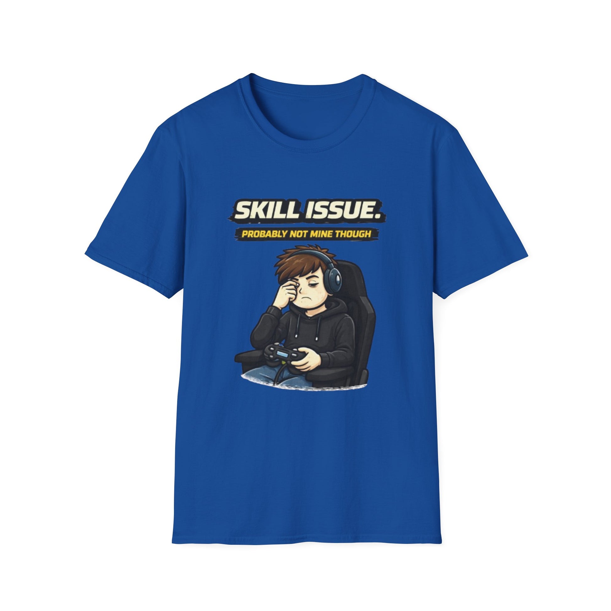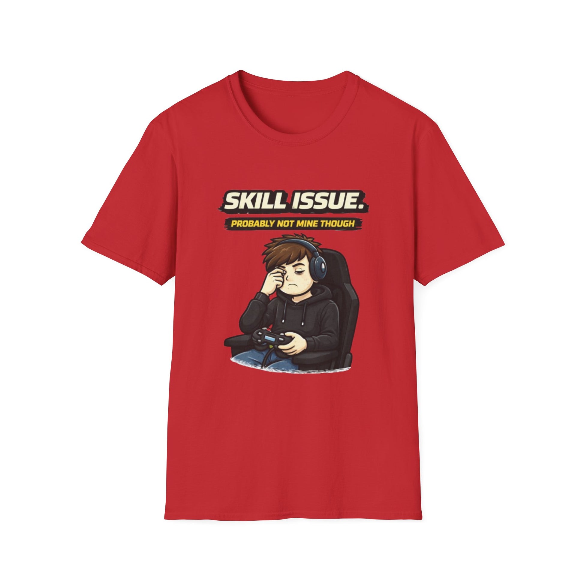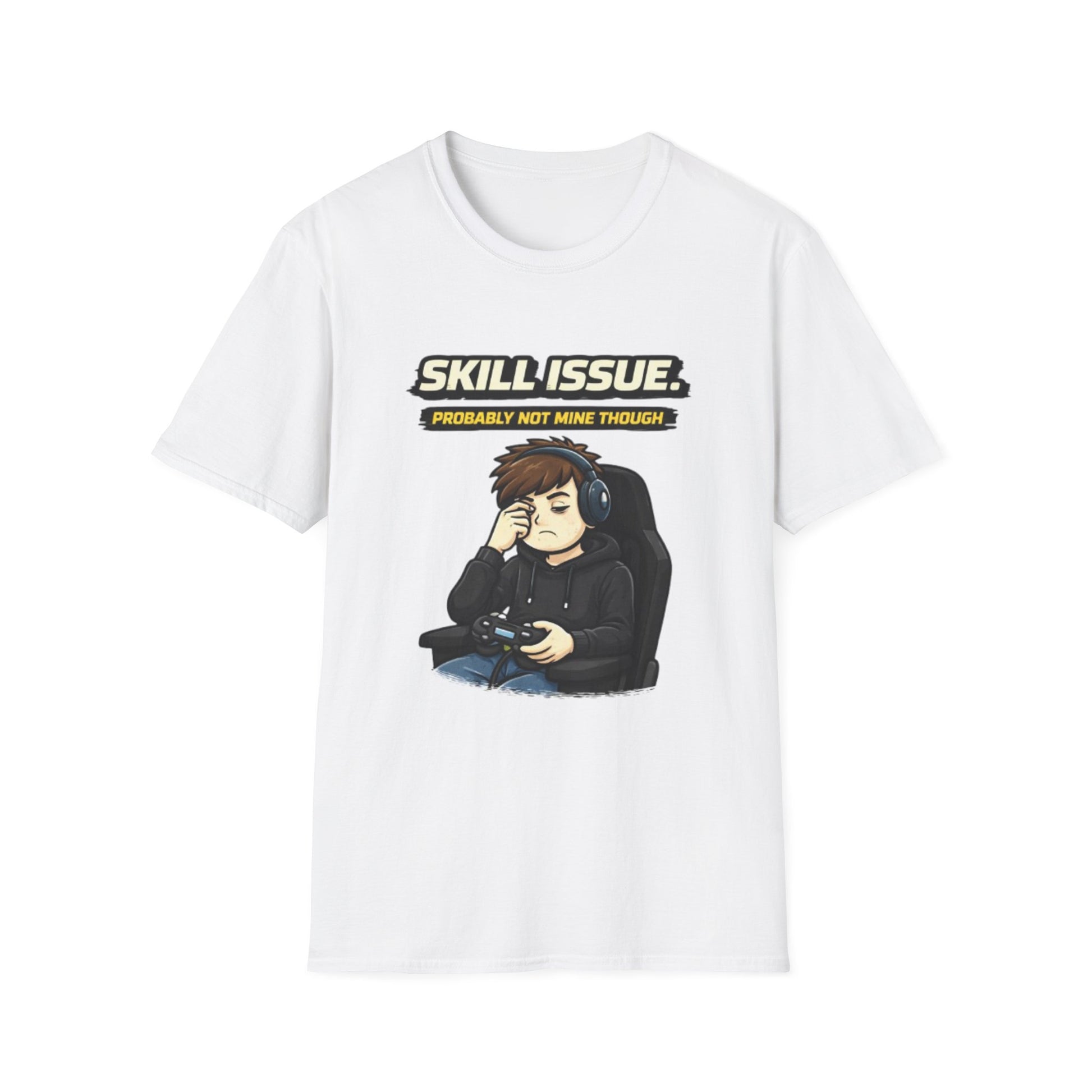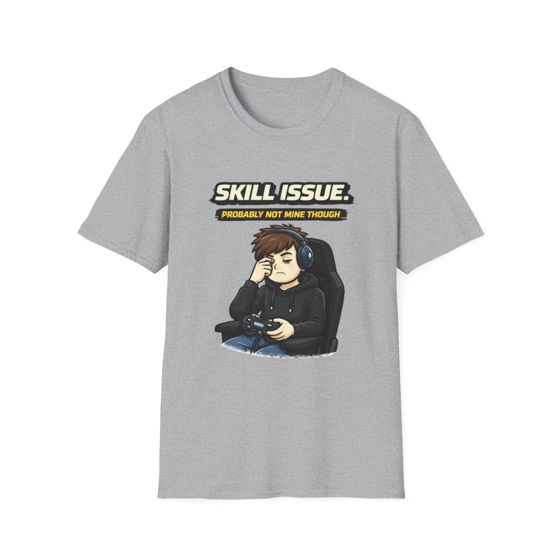 This lightweight cotton tee brings gamer humor and low-key attitude into everyday wear. The front shows a sleepy, headset-wearing player slouched in a gaming chair under the caption “SKILL ISSUE. (Probably not mine though),” giving off that resigned, playful energy after a long session. The soft, ring-spun cotton drapes easily under hoodies or on its own, while the clean crew neckline and classic fit keep the silhouette tidy. Wear it to streams, LAN nights, or when you just want to signal fellow players that you live for the game but not the blame. The muted print palette pairs with jeans, joggers, or comfy shorts and the tear-away label keeps you fuss-free during marathon matches.